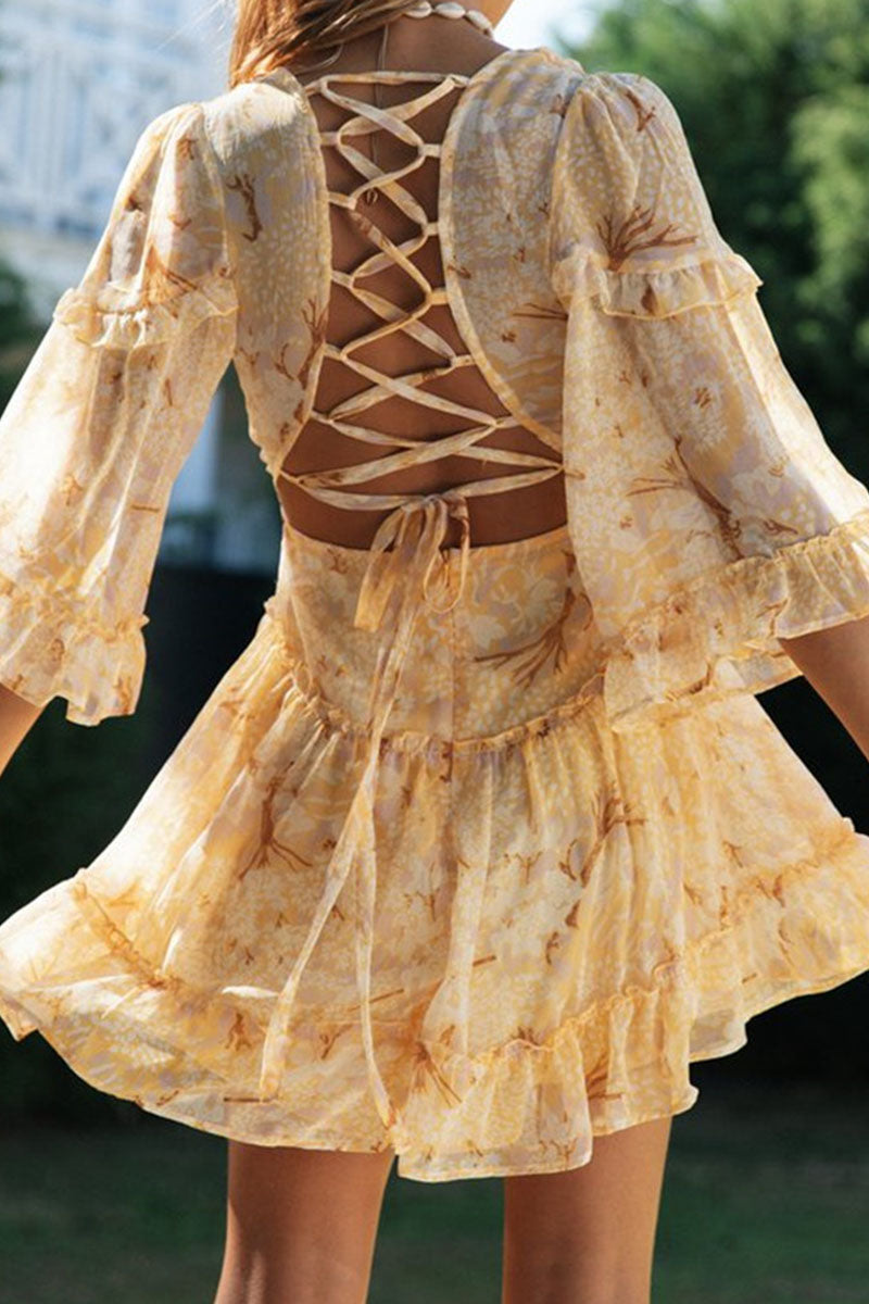 This V-neck dress pairs a flattering V-neckline with romantic bell sleeves and a lightweight, flowy silhouette that transitions easily from daytime outings to evening gatherings. The subtle floral jacquard and tiered mini skirt deliver a feminine, modern look ideal for summer events and casual weekends.